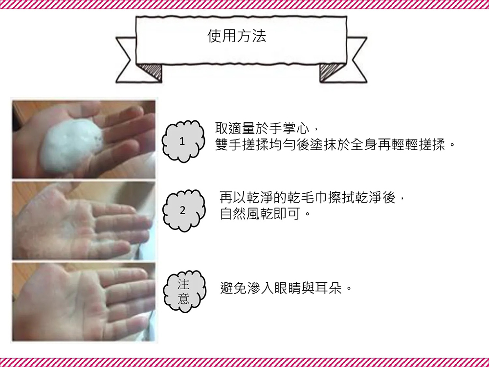 使用前請搖一搖,取適量於手掌心,均勻塗抹於全身或髒污處(避免滲入眼睛與耳朵),再以衛生紙或毛巾擦拭乾淨後,使用梳子梳開即可(不需再使用吹風機吹乾)。