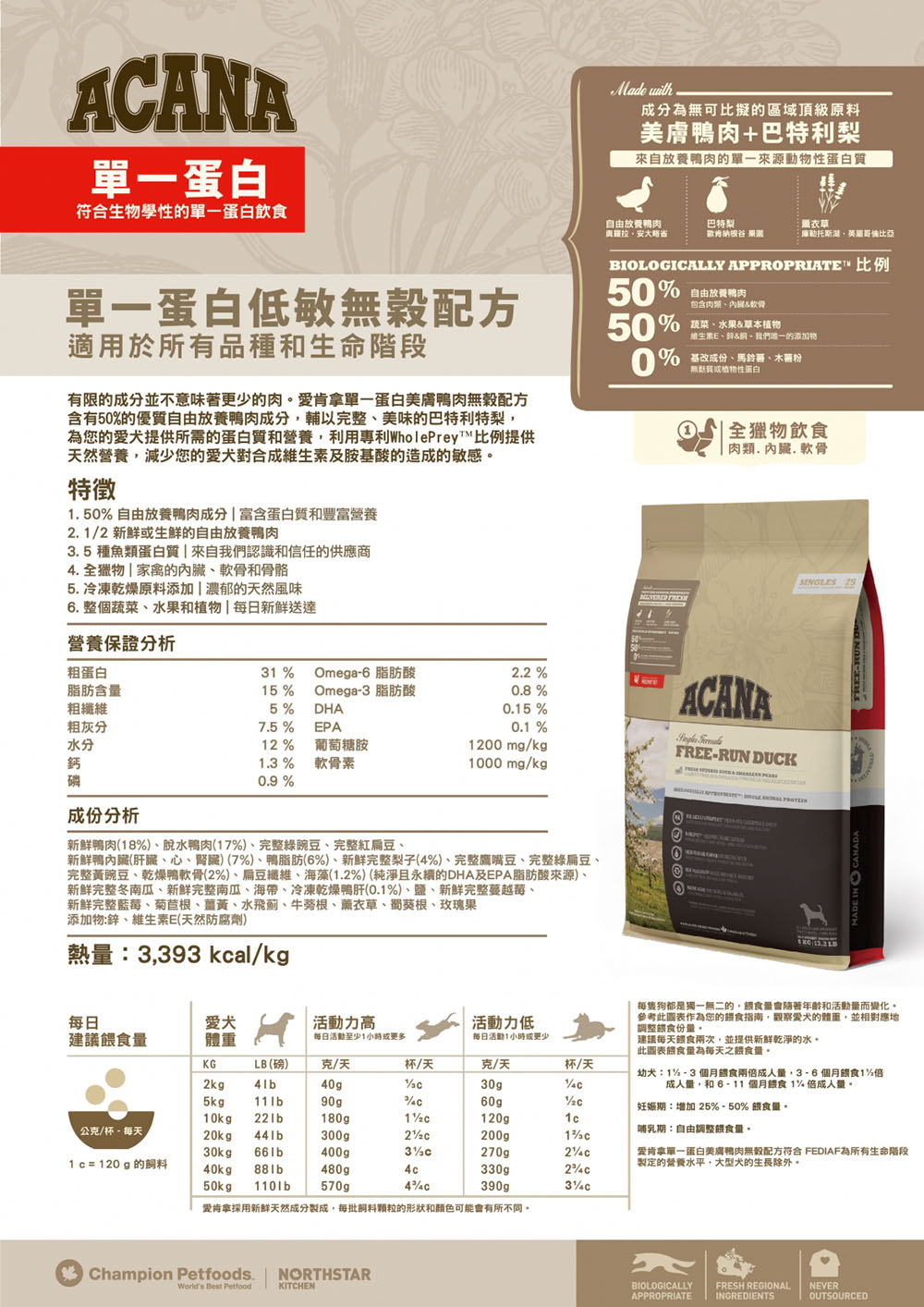鴨肉+梨子ACANA 鴨 & 巴特利梨富含Ontario省 Aurora的放養鴨及來自卑詩省Okanagan谷中吸收充足陽光的成熟巴特利梨,每日新鮮輸送