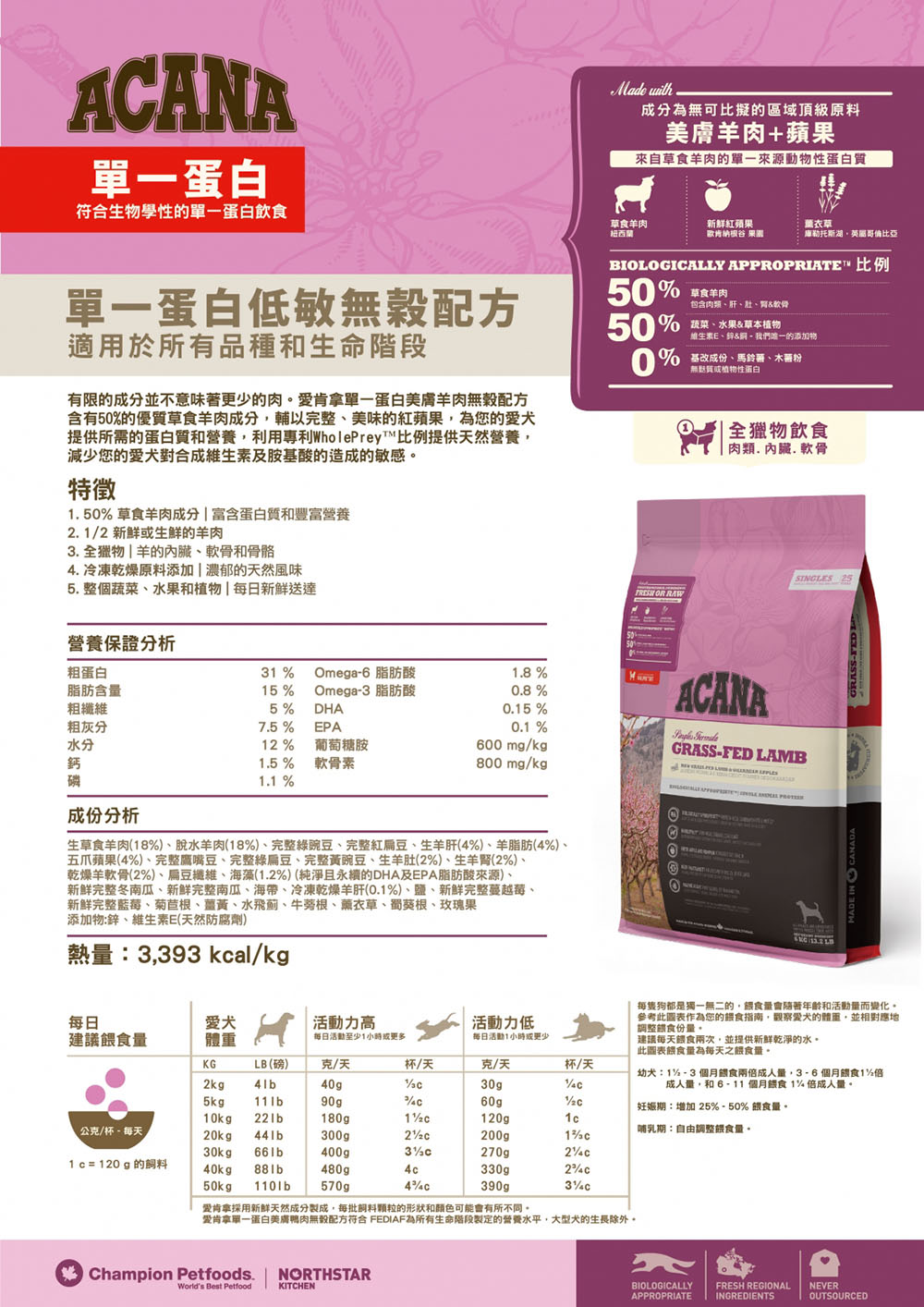 CANA羊肉及Okanagan蘋果配方特色是內含農場養殖羊的羊肉(50%)及卑詩省日曬充足Okanagan谷的蔬果,每日新鮮輸送,無防腐劑,有最佳營養與風味
