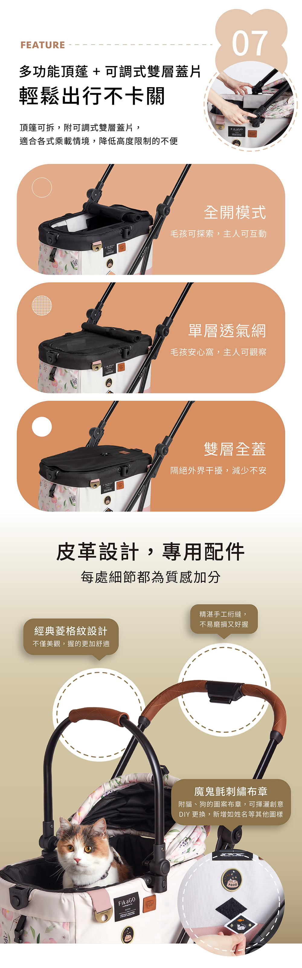 推車含座艙蓋片x1, 魔鬼氈刺繡布章(貓/狗)各1, 車架提籃共用背帶x1, 安全扣繩x1