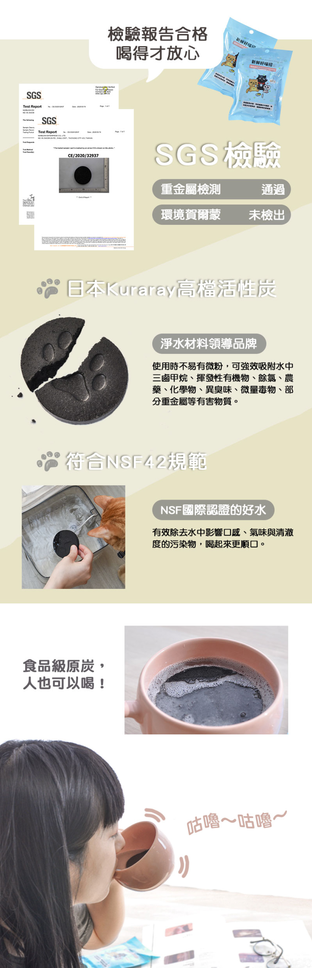 材質 : 95%原生活炭、5%食品級高分子聚合物、使用日本Kurarary高檔活性炭,品質合乎NSF42規範,產品均經SGS檢驗,無重金屬及環境賀爾蒙溶出,合乎歐盟標準,安全無虞