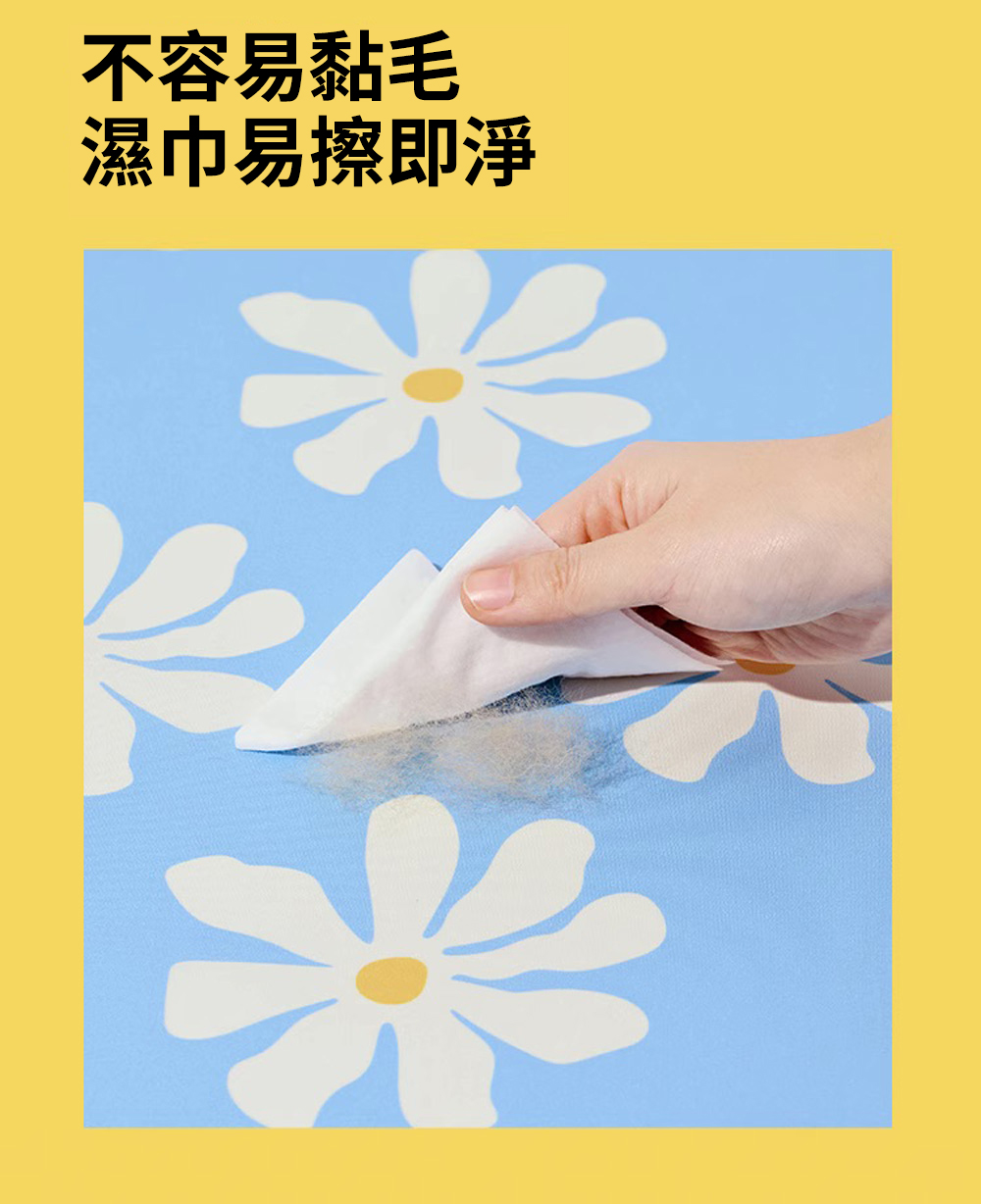 1.不可乾洗、熨燙、漂白、烘乾;日常清理建議優先使用濕紙巾擦拭,或用黏毛器打理表面寵物毛髮。