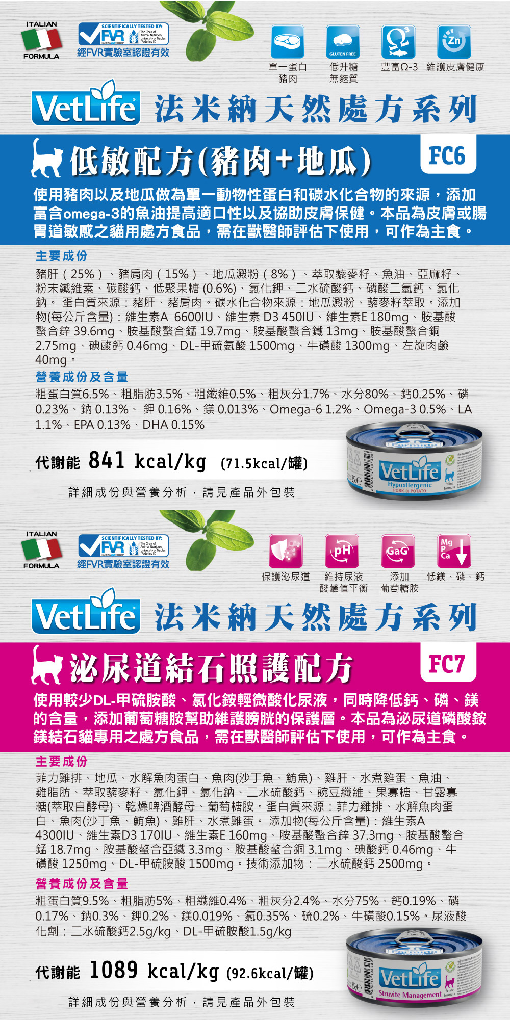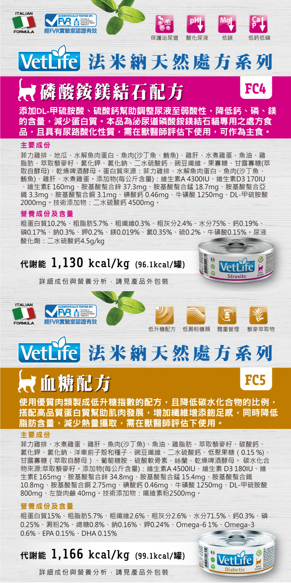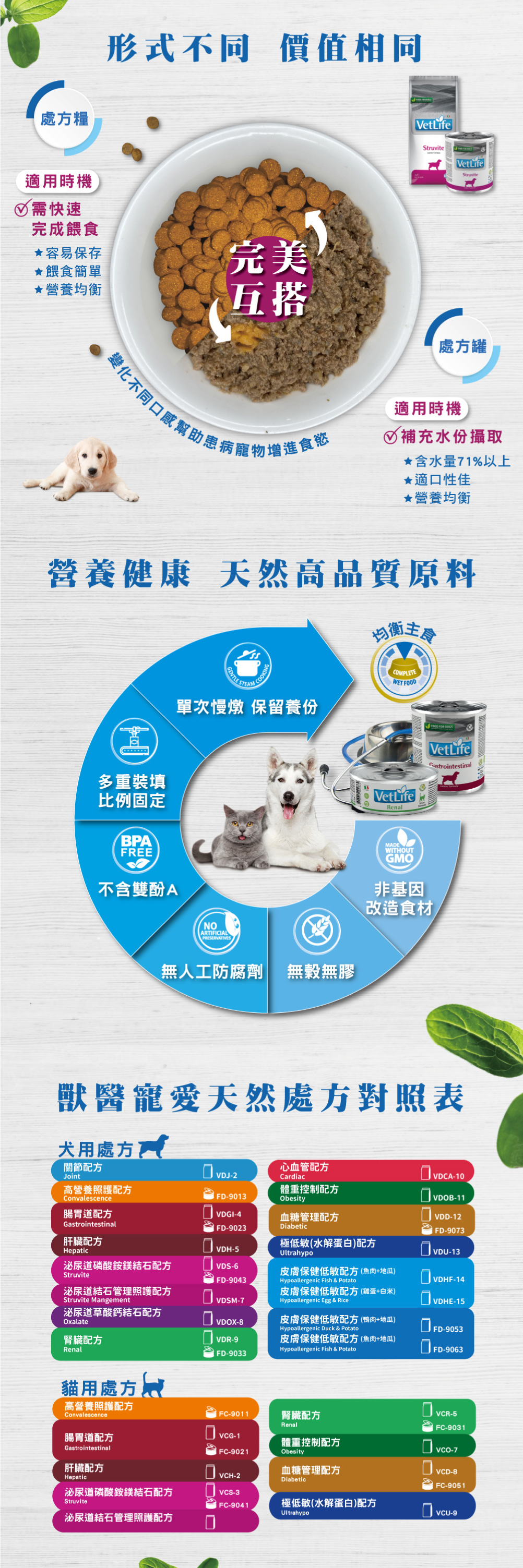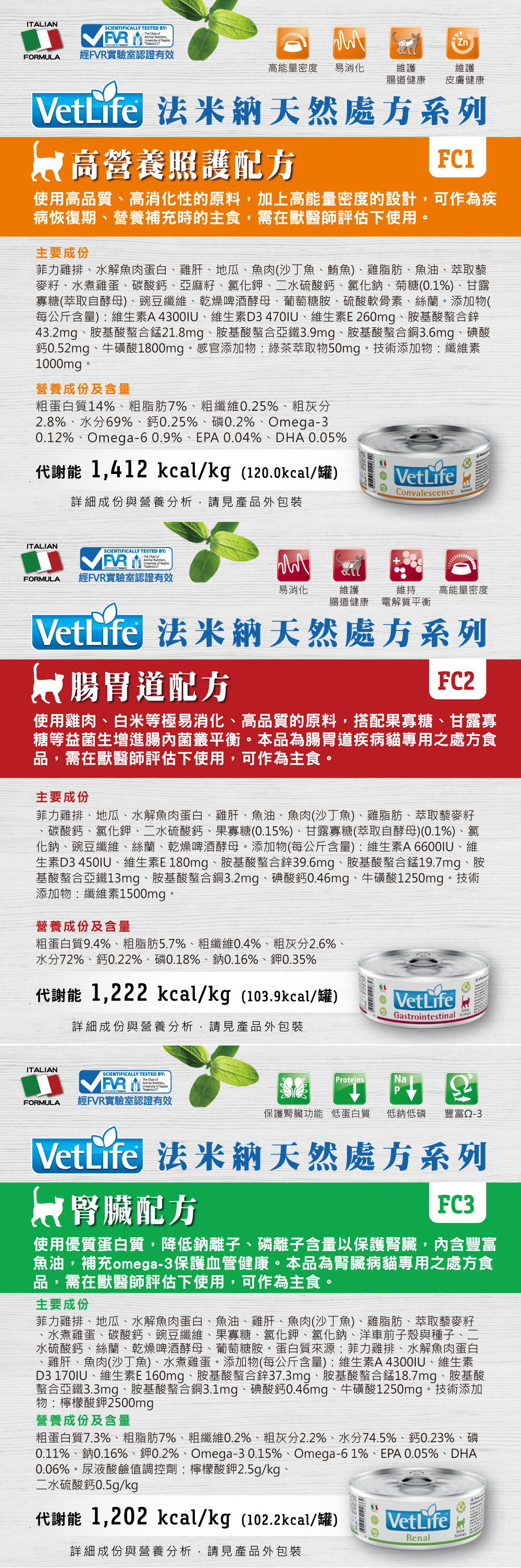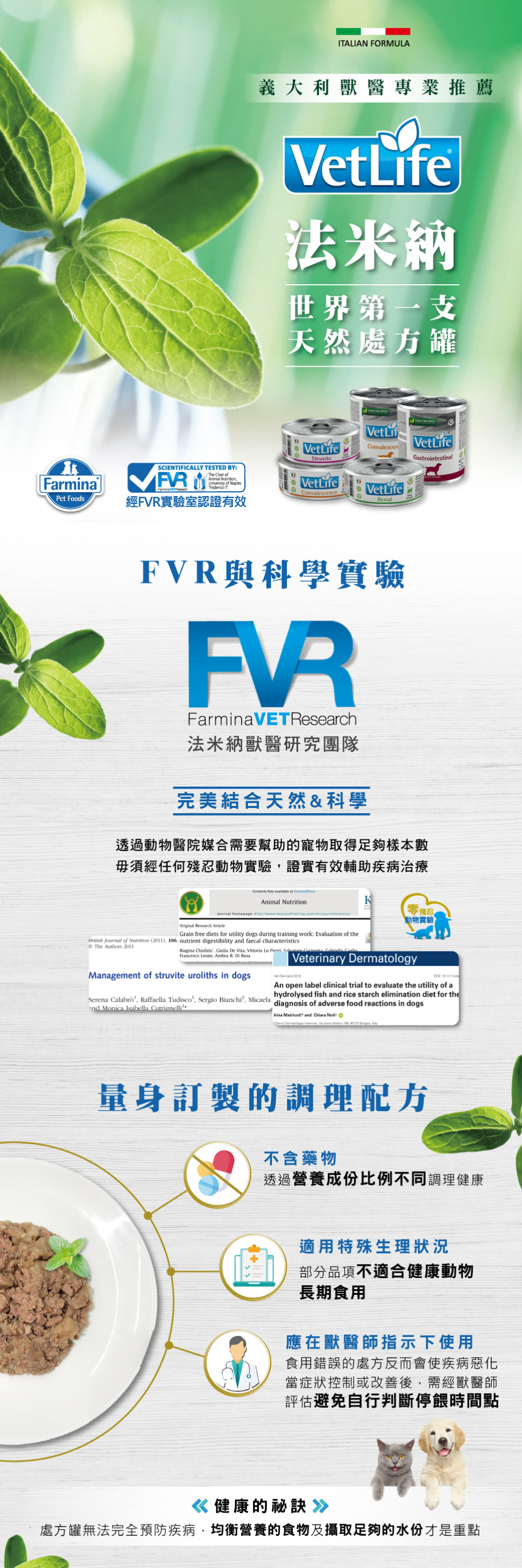 法米納Vet Life高營養照護配方使用高品質、高消化性的原料,加上高能量密度的設計,可作為疾病恢復期、營養補充時的主食,需在獸醫師評估下使用。