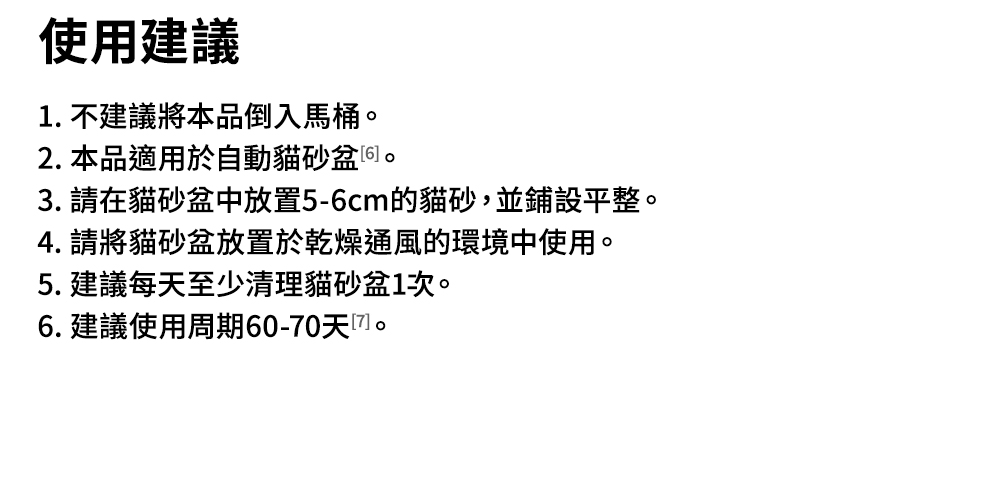 將貓砂平鋪在貓砂盆裡3-5厘米的厚度,為讓貓咪擁有更清潔的如廁體驗,建議每天清理貓貓砂。
